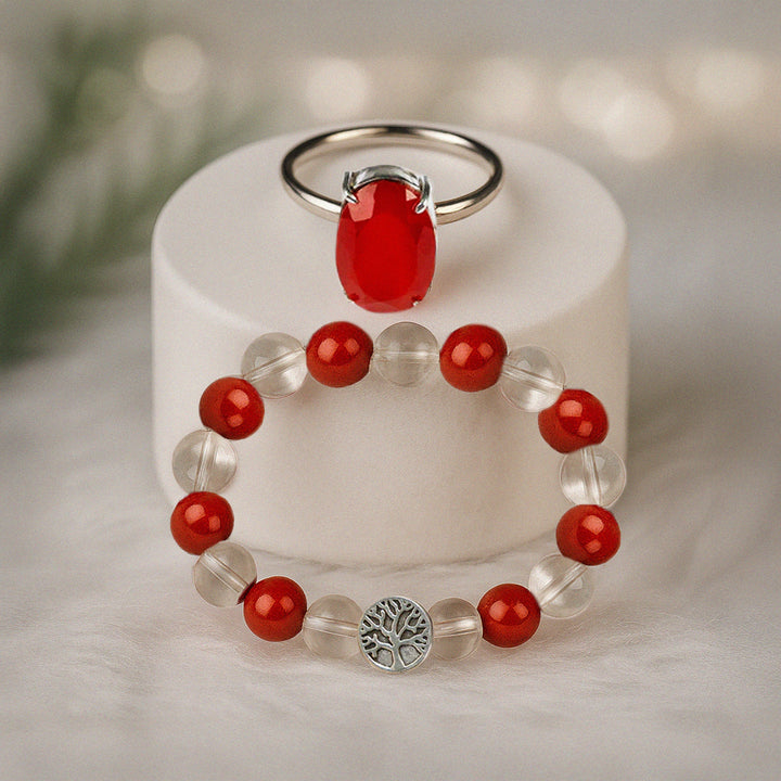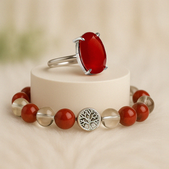 Worn together, the ring fuels courage and motivation, while the bracelet anchors strength and vitality, forming a powerful combination for personal transformation and resilience.